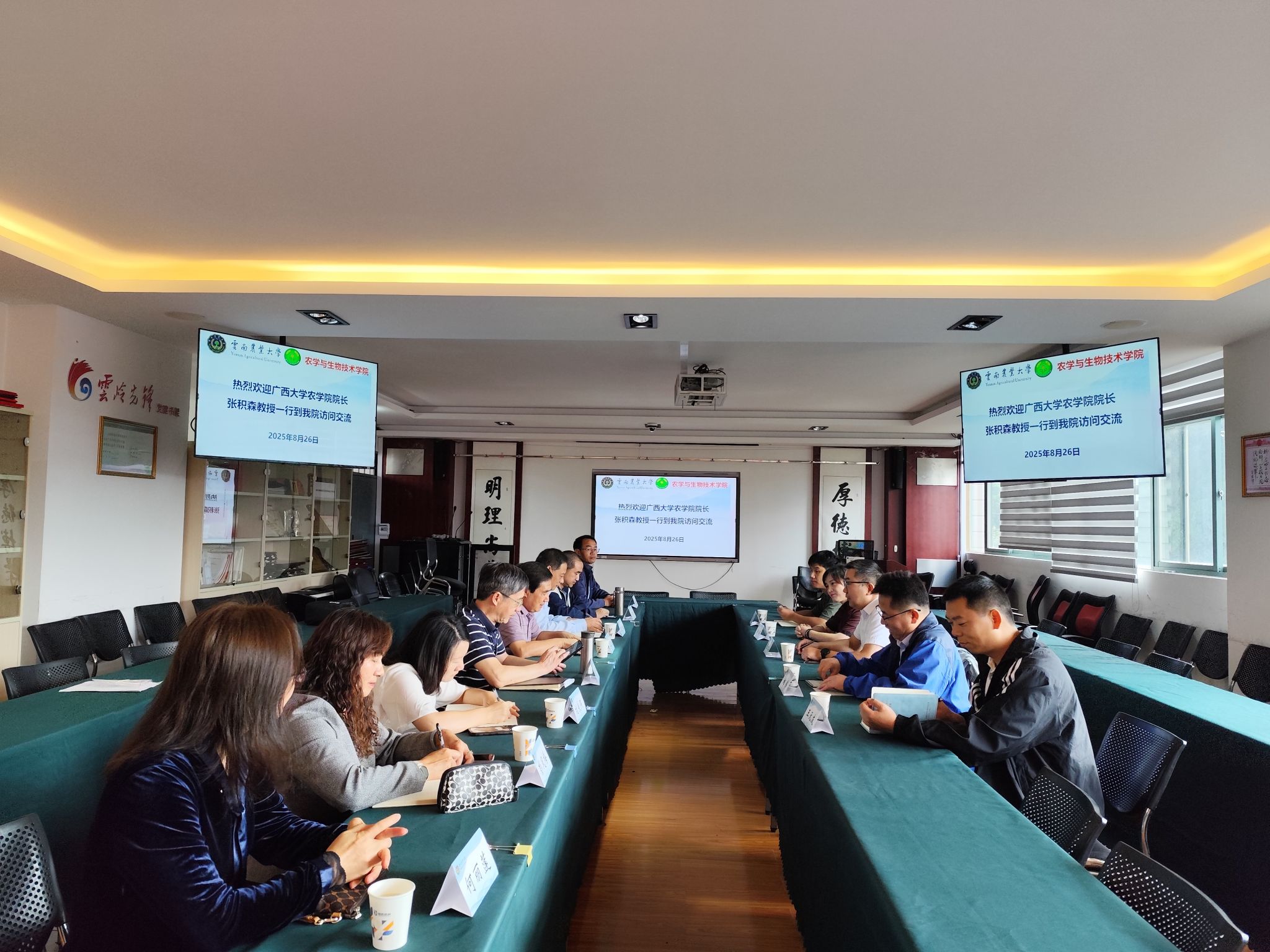 的学科建设、专业设置等进行了介绍。张积森院长和姚伟副院长分享了广西大学农学院在人才培养、科研创新、办学条件等方面的经验与成果。双方一致认为,两校农学院在地理位置、学科背景上具有相似性,合作潜力巨大,未来应加强互动,互学互鉴。