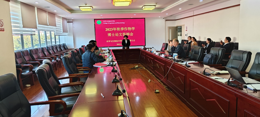 本站消息:2023年11月25日,2023届作物学博士研究生学位论文秋季答辩会在云南农业大学西校区至诚楼424会议室举行。答辩专家委员会主席由云南大学黄斌全研究员担任,专家组成员包括中国林业科学院高原林业研究所杨汉奇研究员,云南省农业科学院唐开学研究员、陈璇研究员,云南农业大学赵正雄教授、郭华春教授、范伟教授。作物学博士授权点负责人陈军文教授主持会议。