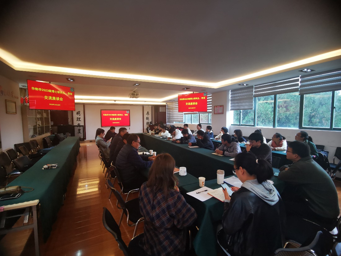 座谈会上,陈军文首先就作物学学科发展历史、学科建设、人才师资队伍及目前面临的困境等情况做了介绍。随后邀请国家自然科学基金优秀青年基金获得者杨建立教授做科研经验分享,杨建立强调读博期间应该多读文献、博士生应对研究课题了如指掌,并强调了研究材料的重要性和读博期间应有责任感和紧迫感。随后,2023级博士生就未来应如何读博和读博的目的依次发言,表示会在未来学习生活中互帮互助、践行吃苦耐劳的科研精神,坚定信仰,脚踏实地,刻苦钻研。与会博士生导师依次分享了自身博士期间的心路历程并提出如何读好博士的相关建议和要求。