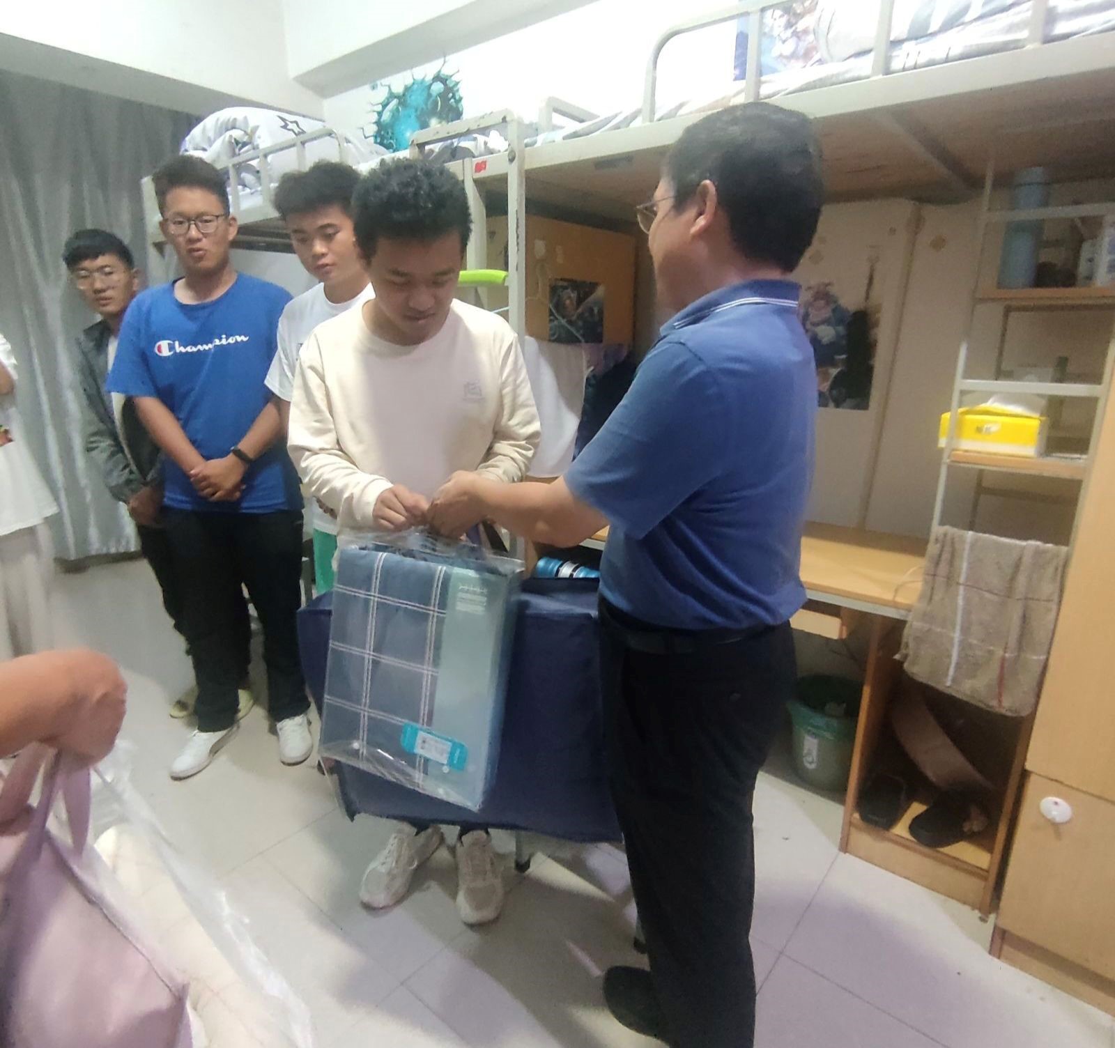 学院领导和老师们一声声的问候,一句句的嘱咐,缓解了新同学们第一次离开家乡的思乡之情,走访即将结束时,学院领导代表学校向同学们赠送了床单被褥等生活用品,并再次叮嘱同学们:“在学习和生活上有任何问题,都可以找班主任、辅导员,希望同学们在未来的大学生活中都能有所收获有所成长。”