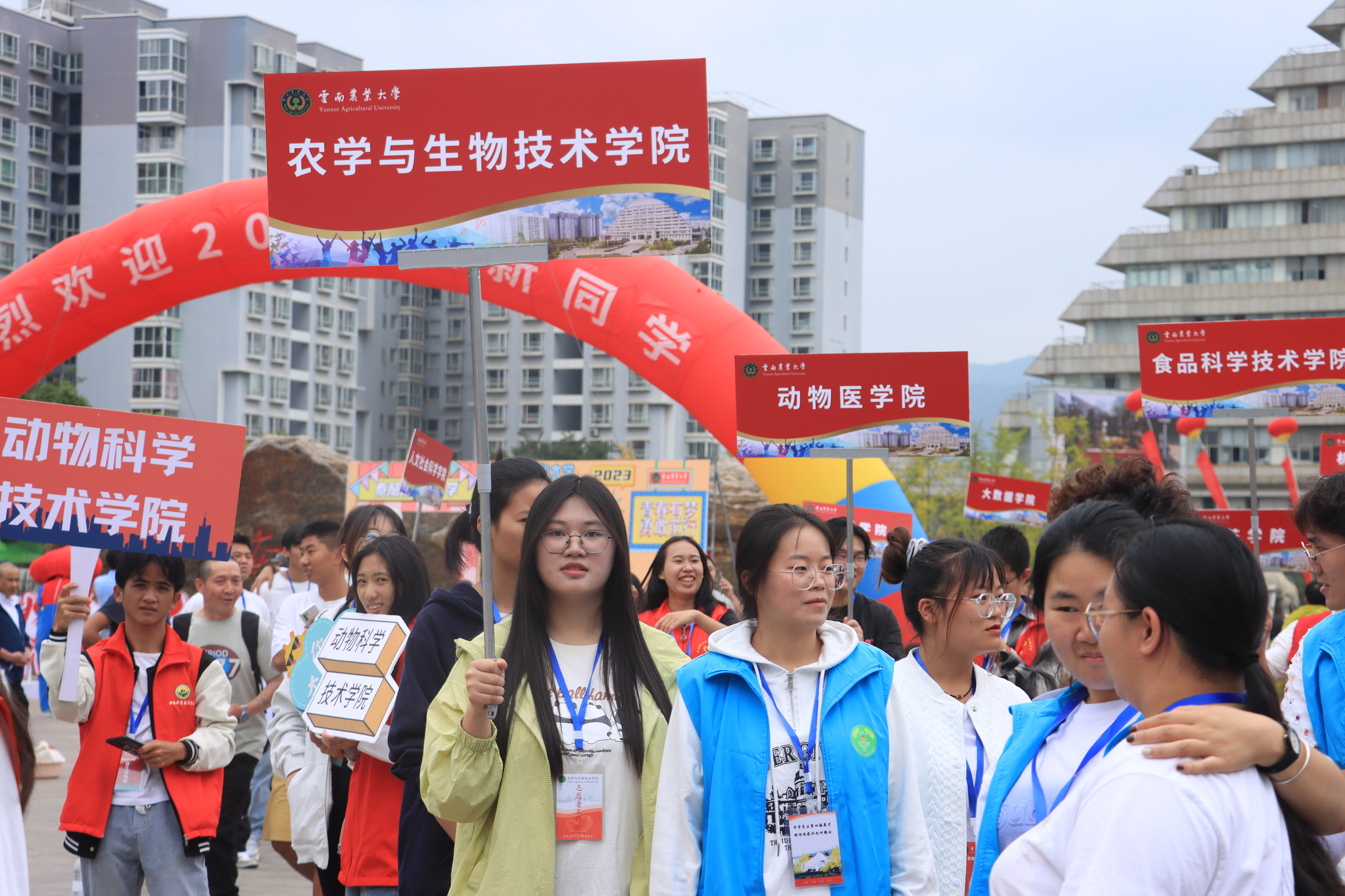 迎新志愿者们与老师们热烈欢迎着新生们的到来,萌新们将与云农学长学姐携手,一同度过未来美好时光。