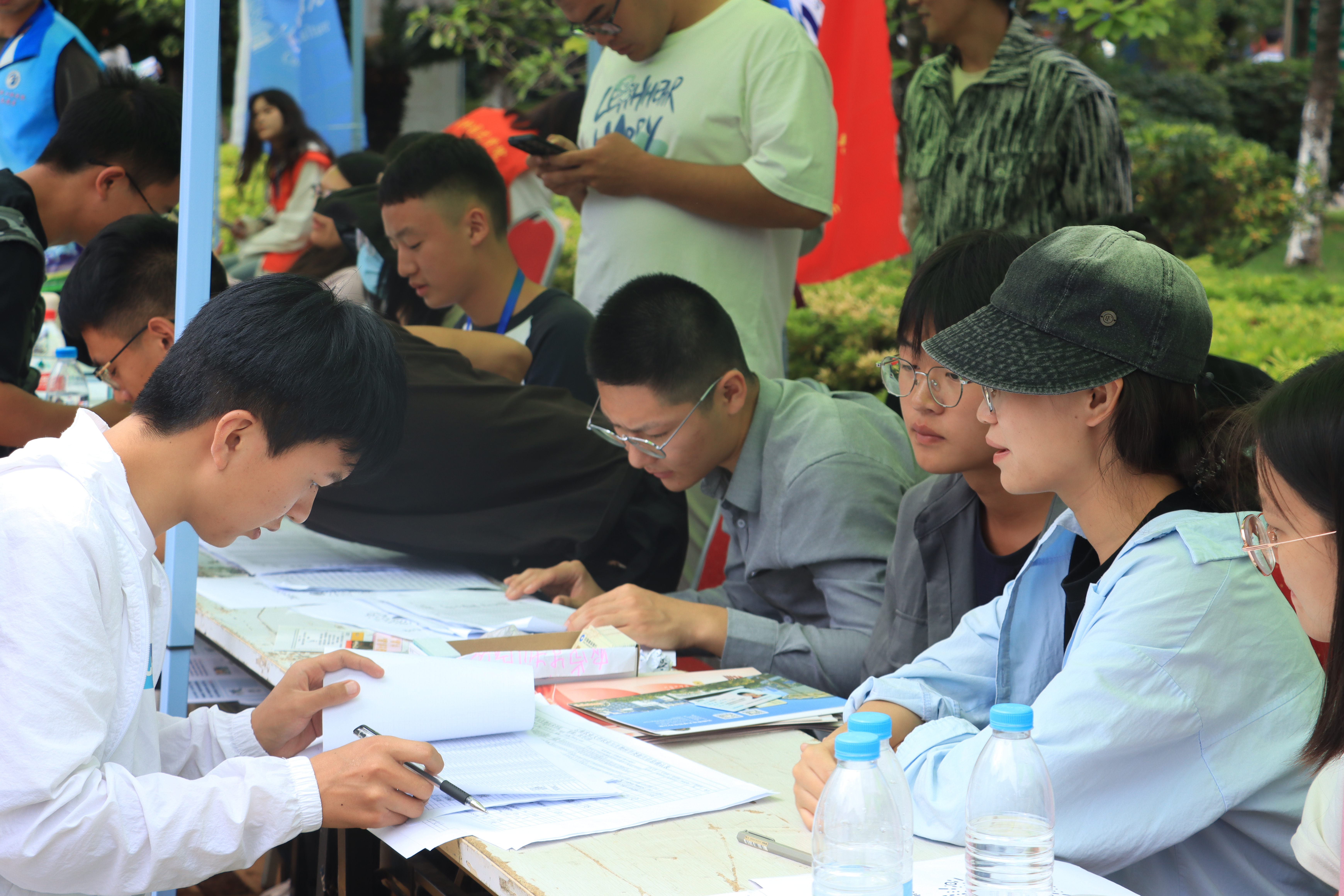 负责迎新的老师和同学们正紧锣密鼓的安排迎新流程,他们各司其职,在自己的岗位上勤奋的工作着,为新生们保驾护航。为保障后勤工作,学院为志愿者们提供了饮用水和爱心餐。