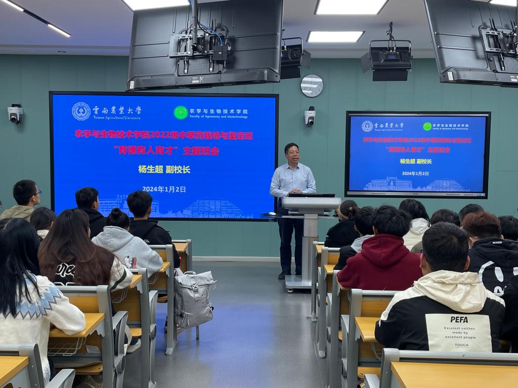 2024年新年伊始,云南农业大学杨生超副校长于1月2日,深入学生一线,主动与所联系的黑白直播nba 2022级中草药栽培与鉴定班,召开了 “育德、育人、育才”主题班会。学院相关领导、辅导员也一同参会。