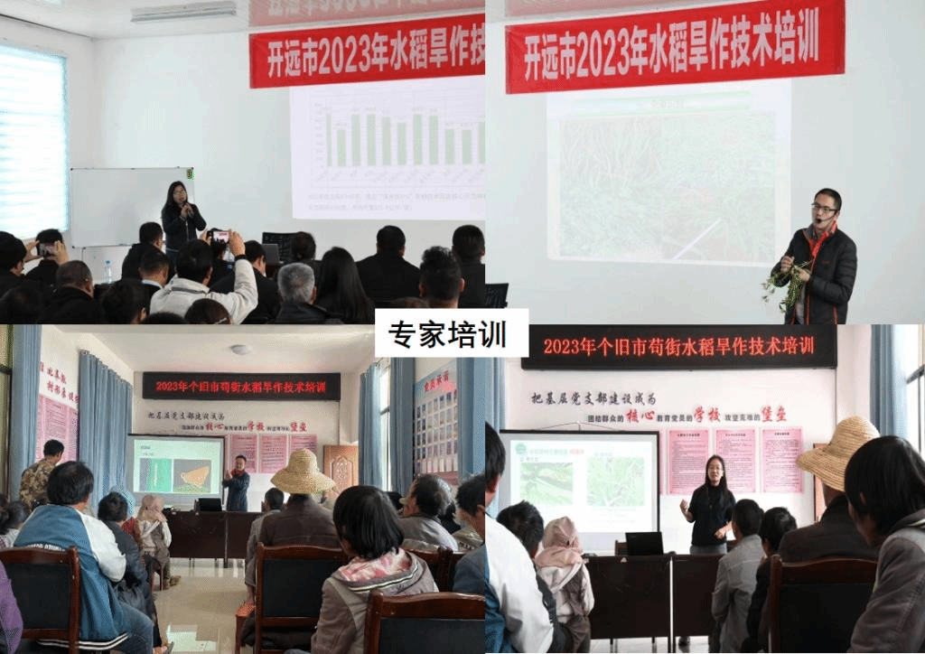 3月13-14日,2023年水稻旱作技术培训在红河州开远市中和营镇和个旧市卡房镇苟街村两地开班起航,云南农业大学朱有勇院士、云南农业大学朱书生副校长、国内合作与社会服务处朱仁俊处长、烟草学院刘雅婷院长和水稻旱作技术团队,西南林业大学何霞红副校长以及红河州各级领导班子参加此次活动;红河州、市、县、乡镇农技人员、农业种植合作社、优质米企业、种植户等142余名学员参加培训。