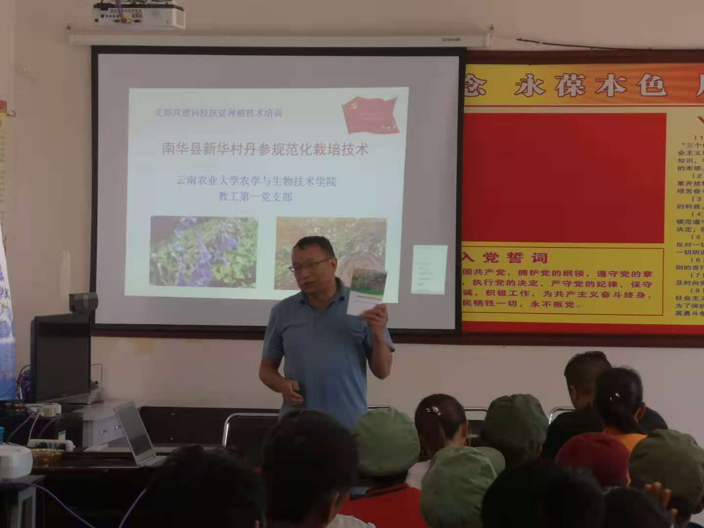 教工第一党支部与南华县沙桥镇新华村总支开展支部共建。由陈军文、徐绍忠、希从芳、海梅荣、赵艳等人组成“三区”服务技术团队,根据南华县沙桥镇新华村自然气候和农业生产实际,充分发挥自身专业技术优势,重点开科技服务、科技咨询工作,协助成立专业合作社,编制种植技术手册,探索出“支部共建+公司+基地+农户”科技扶贫推广模式,该模式由党支部牵头,协会提供技术支撑,公司定点收购,能最大化降低农户种植风险,保障农户利益,实现脱贫目标和促进乡村建设。经过不懈努力,团队战胜了疫情影响、干旱等困难,带动当地经济发展取得良好效果。